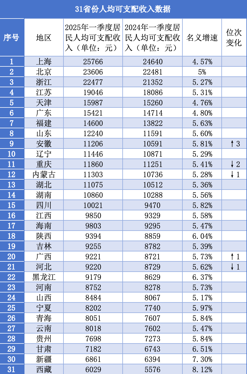 分省份来看,一季度居民人均可支配收入方面,上海继续稳坐榜首,达25766元,北京和浙江位列第二、三位,分别为23606元和22477元。