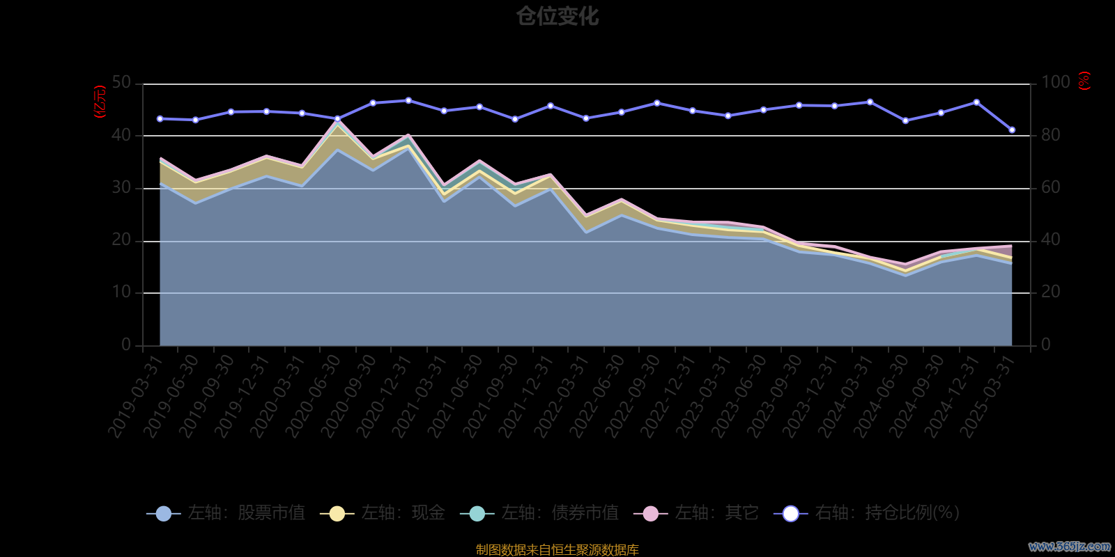 据定期报告数据统计,近三年平均股票仓位为89.59%,同类平均为87.36%。2020年末基金达到93.56%的最高仓位,2025年一季度末最低,为82.32%。